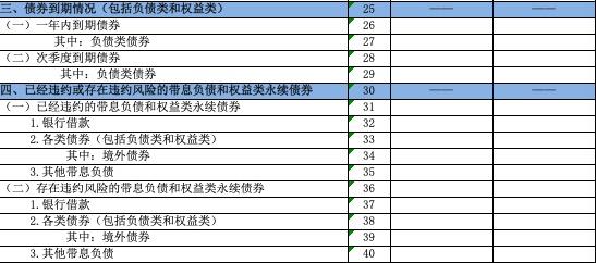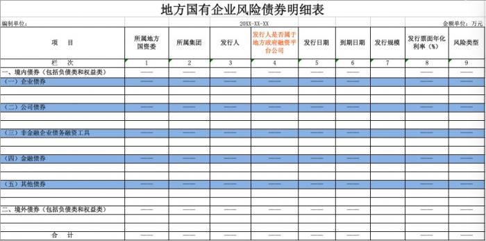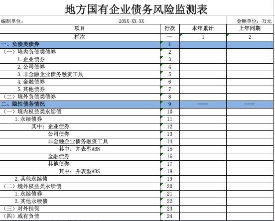 地方国有企业债务风险监测表统计地方国资委系统监管企业负债类债券、权益类永续债等隐性债务、债券到期、已经违约或存在违约风险的带息负债和权益类永续债券等期末的本金余额情况。