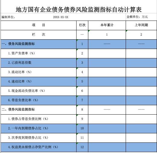 地方国有企业债务债券风险监测指标自动计算表由系统自动计算,用于监测债务风险、债券风险情况,前者包括资产负债率、流动比率等指标,后者关注债券占带息负债比例、一年内到期债券占比、次季度到期债券占比、权益类永续债占净资产比例等指标。
