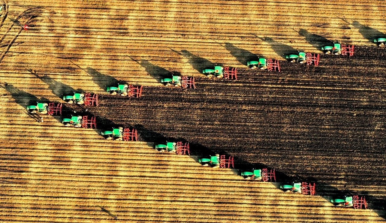 △2020年9月30日,北大荒集团九三分公司尖山农场、鹤山农场的大豆、玉米、小麦田里几十台收获机车、灭茬、整地机车列队前进。
