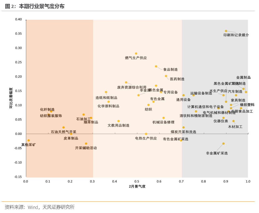 2月除个别开工受限的采掘行业外,其余37个行业景气度出现环比改善。目前46%的行业已经位于高景气区间,但较多中下游行业仍有改善余地。
