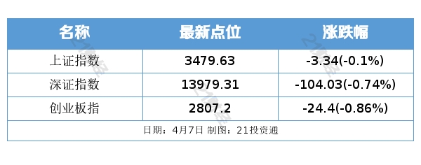 4月7日,A股三大指数集体收跌,市场成交量持续低迷,两市合计成交7400亿元,行业板块多数收涨,钢铁行业与港口水运板块大涨。个股方面,人气股受市场追捧,美邦服饰、中电电机等高位股继续连板,长源电力、南网能源等前期人气股涨停。