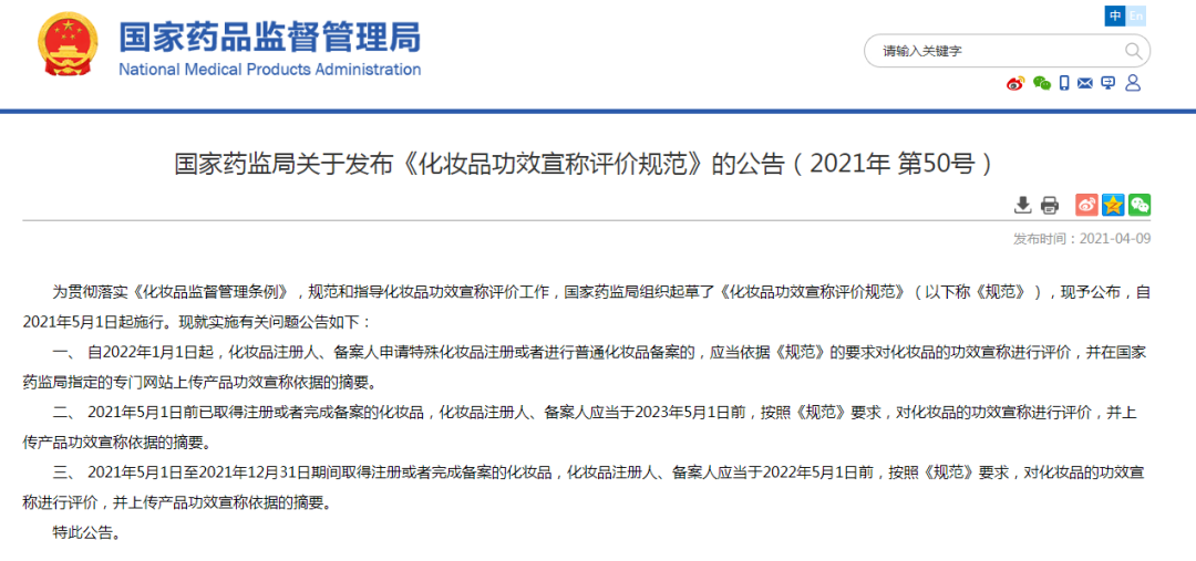 以《规范》为例,自2022年1月1日起,化妆品注册人、备案人申请特殊化妆品注册或者进行普通化妆品备案,应当进行化妆品功效宣称评价,并在指定的专门网站上传产品功效宣称依据的摘要。