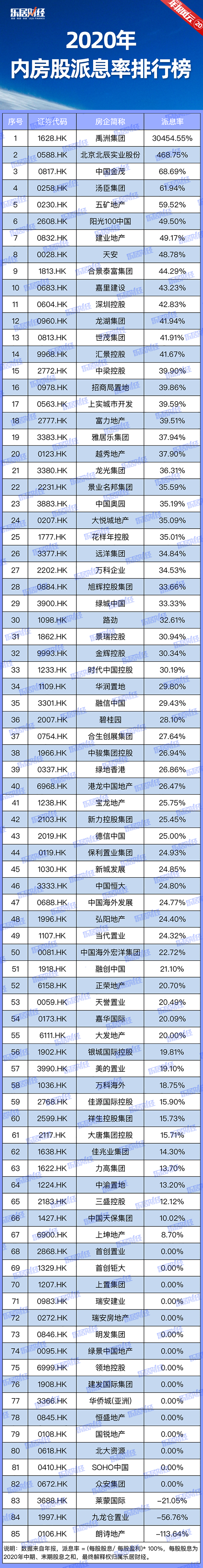 如剔除禹洲集团,榜单内84家内房股平均派息率为26.96%,北京北辰实业股份派息率为468.75%,中国金茂、汤臣集团、五矿地产派息率超过50%;新晋上市房企中,金辉控股、港龙中国派息率居前,分别为30.34%、26.47%;另外,莱蒙国际、九龙仓置业、朗诗地产在每股收益亏损的情况下选择派息。