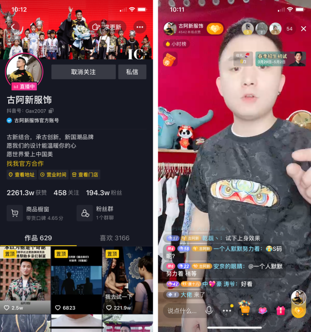 比如苗绣推广人杨春林(抖音号@古阿新服饰 )2018 年入驻抖音,2020 年因为疫情关闭了北京等多家线下门店,去年 3 月开始主推线上展示和直播,结果过去需要花费一年才能卖完的衣服,短短半个月就销售一空。