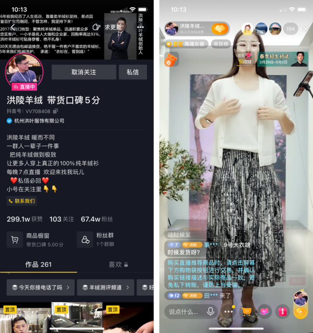 抖音羊绒品类商家洪陵旗舰店(抖音号@洪陵羊绒),从 2018 年在抖音上开始普及羊绒知识,让更多的人了解和知道纯羊绒,目前,其视频播放量已过亿。
