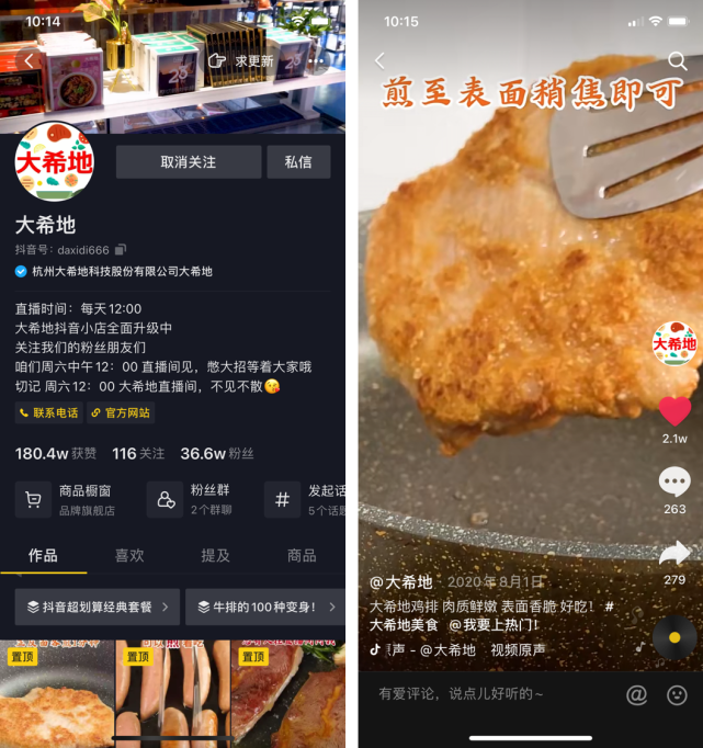 比如大希地旗舰店(抖音号@大希地),既会通过品牌介绍、生产过程展示、产品美食制作教学、现场品尝等短视频内容触达用户;也会采取自播和达人合作带货形式,跟罗永浩,朱梓骁,涂磊等达人,以及喜哥喜嫂、浪味仙等垂类达人合作;还会打造明星专场合作直播间,根据时间节点不同打造不同的主题。
