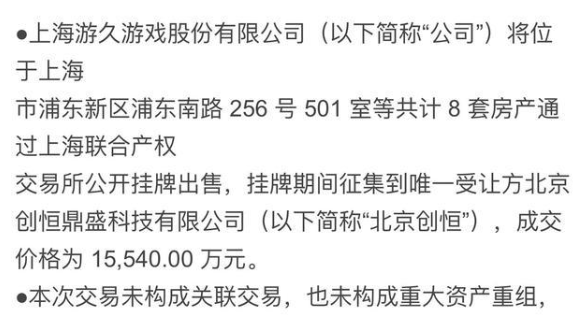前面说了上市公司卖房的操作之后,才发现这是一个看起来简单,做起来难的事情。比如在2019年底的时候,*ST游久公告,公司拟将位于上海市浦东新区浦东南路256号501室等共计8套房产通过上海联合产权交易所公开挂牌出售,出售的房产建筑面积合计2852.74平方米,挂牌价格参考上海沪港房地产估价有限公司出具的《房地产市场价值估价报告》的评估价值1.55亿元,最终出售价格以实际成交价为准。本次交易预计将增加本期归属于上市公司股东的净利润约8000万元。