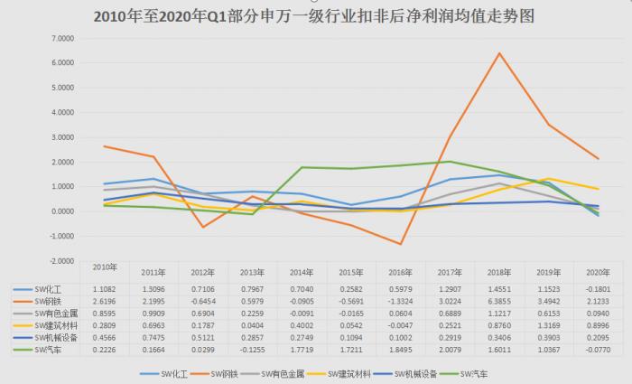 按照这一方法统计后数据为。2010年至2020年,采掘行业扣非后归母净利润均值为7.15亿元,2020年为0.99亿元;化工行业同期均值为0.84亿元,2020年为-0.18亿元;钢铁行业均值为1.62亿元,2020年为2.12亿元;有色行业均值为0.48亿元,2020年为0.09亿元;建材行业均值为0.45亿元,2020年为0.9亿元;机械设备行业均值为0.34亿元,2020年为0.21亿元;汽车行业均值为0.93亿元,2020年为-0.08亿元……