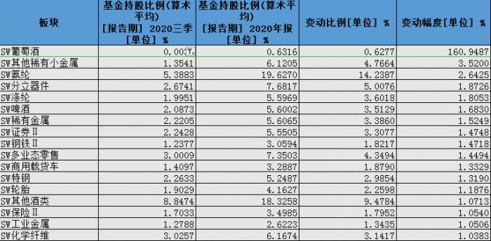 对比可以看出,除葡萄酒行业由于基数极低导致变动幅度过大外,其他行业基金持股增幅普遍在1倍至3倍之间。