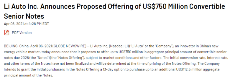 此外,理想汽车周四宣布7.5亿美元可转换债券定价,每1000美元债券可转换35.2818股ADS,转换价为每ADS28.34美元。