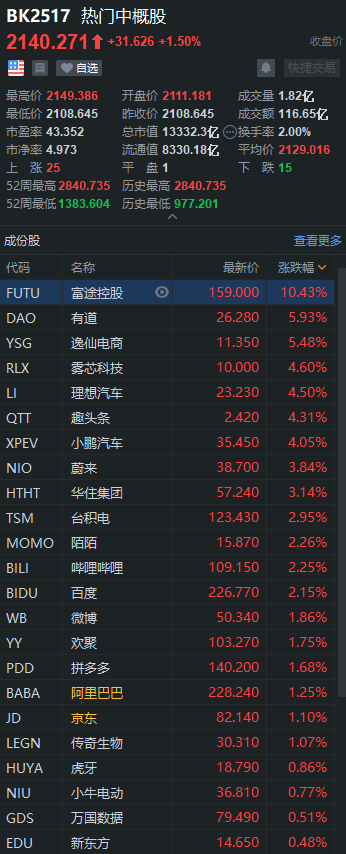 其他中概股,联代科技跌48.52%,嘉银金科涨超17%,第九城市涨超14%,有道涨5.93%,逸仙电商涨5.48%,优信跌4.9%,跟谁学跌3.81%,腾讯音乐、爱奇艺跌超2%。