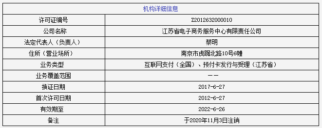资料显示,江苏省电子商务服务中心有限责任公司成立于2003年10月23日,注册资本为1亿元,业务类型为互联网支付(全国)、预付卡发行与受理(江苏省)。