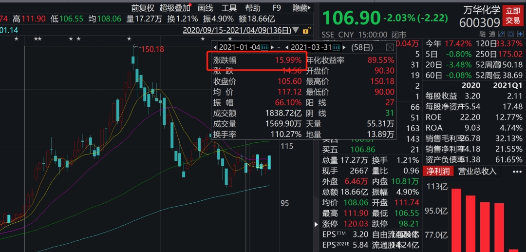 4月9日晚间,“化工茅”万华化学披露惊艳的一季报:一季度归属于母公司所有者的净利润66.21亿元,同比增长380.82%;营业收入313.12亿元,同比增长104.08%;基本每股收益2.11元,同比增长379.55%。