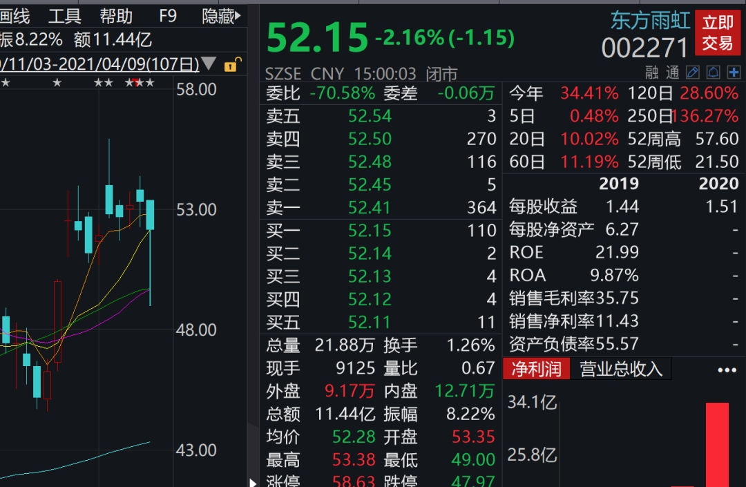 据上市公告书显示,此次定增发行价格为45.50元/股。 虽然这几天该股震荡回落,但最新股价仍高于定增价格,为52.15元每股,傅鹏博仍赚近4400万元。