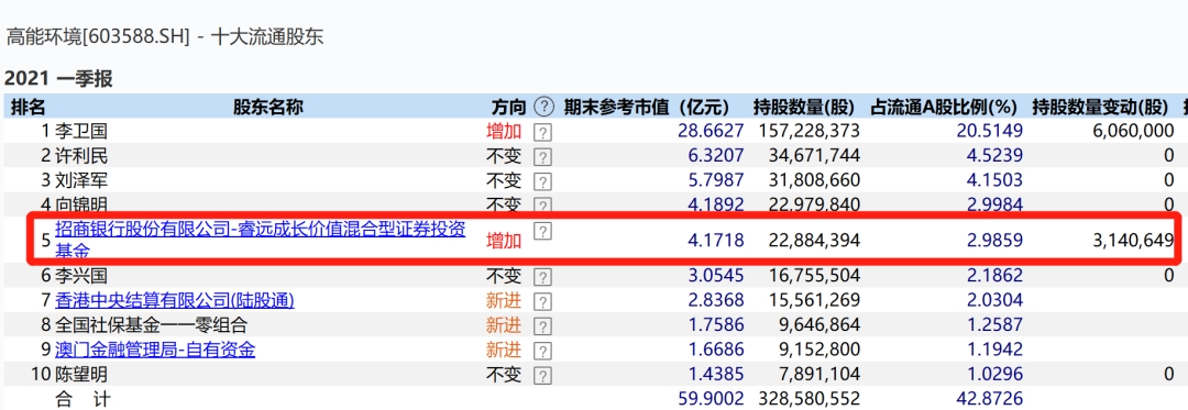 与此同时,资料显示,傅鹏博在一季度新晋成为该股的第八大流通股东。截至一季末,傅鹏博执掌的睿远成长价值持有万华化学1270.9万股,持有价值超13.4亿元。按照持有市值计算,万华化学也新晋成为傅鹏博的前十大重仓股了。