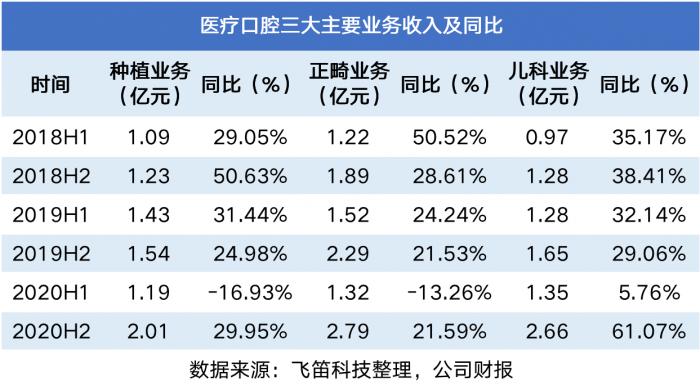 由于分业务只公布半年度和年度数据,因此将我们近三年数据拆分为6个半年度的数据,以用来观测公司三项业务的增长情况。可以看出,2018年以来,三项业务收入和增速大多数周期都比较接近,但2020年上半年,疫情打乱了这三大业务的增长节奏,种植业务和正畸业务均出现负增长,儿科业务维持正增长,到了2020年下半年,种植业务和正畸业务恢复到2019年同期的增长水平,儿科业务则实现61.07%高速增长。