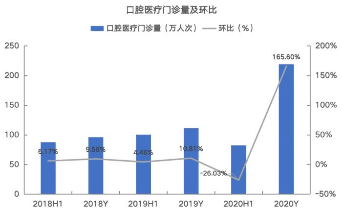 由上面的表格可以看出,在2020年之前,口腔医疗门诊量整体增速较为稳定,到了2020年上半年出现负增长,下半年反弹,符合疫情下业务量恢复的情况,2020年全年口腔医疗整体增速为3.28%,2019年同期为15.14%。