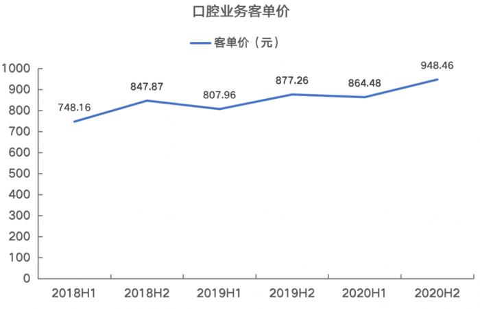 再看客单价,近三个年度以来,通策医疗的客单价整体上移,2020年上半年,受疫情影响不明显,下半年,客单价为948.46元/人次,上升了一个台阶,这也是口腔业务下半年收入增速快于营收增长的主要原因。
