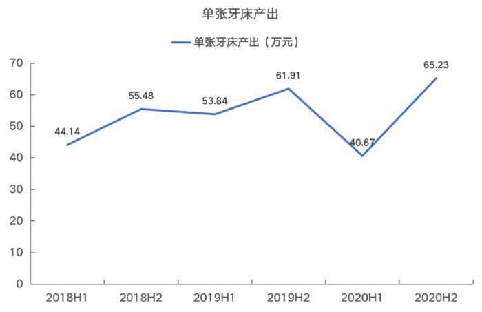 开设牙椅数量的增加,并没有使单张牙床产出金额下降,截至2020年下半年,通策医疗的单张牙床产出金额为65.23万元,创出了新高。