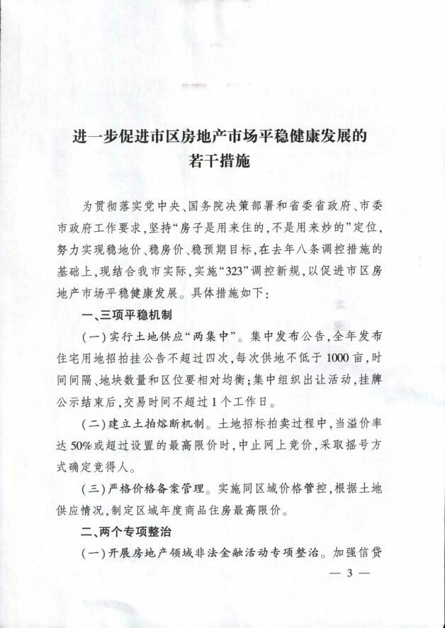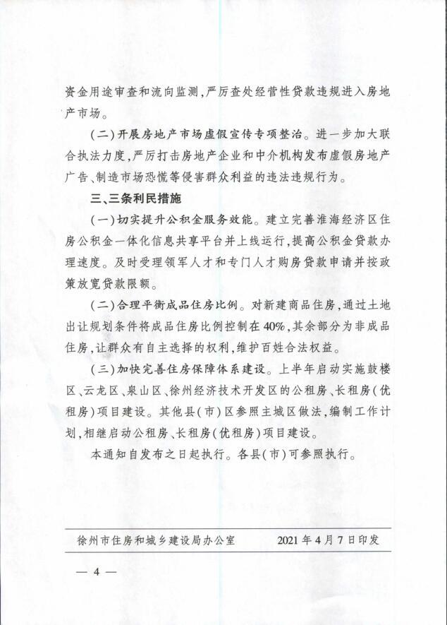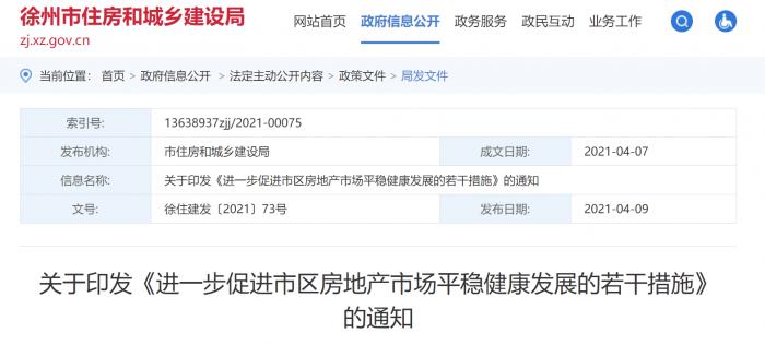 4月9日晚间,江苏省徐州市住房和城乡建设局发布进一步促进市区房地产市场平稳健康发展的若干措施的通知。通知提出提出,徐州市将实行土地供应“两集中”,全年发布住宅用地招拍挂公告不超过四次,每次供地不低于1000亩,时间间隔、地块数量和区位要相对均衡。建立土拍熔断机制。严格价格备案管理,实施同区域价格管控,根据土地供应情况,制定区域年度商品住房最高限价。