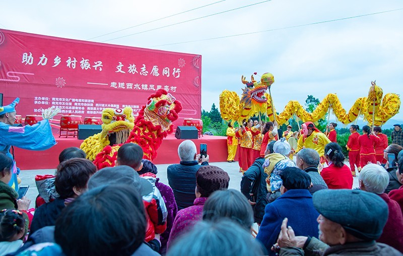 据了解,来自南充市各文艺单位的80余位文艺家和文艺工作者与南部县升钟湖百家无声文化艺术协会携手同台为当地群众献上了精彩的文艺节目。两场活动分别在两个美丽的新农村演出,吸引了周边300余名群众驻足观看。村民们兴高采烈地说,能在家门口欣赏到南充市文艺家们高水平的文艺节目,感到快乐和满足。