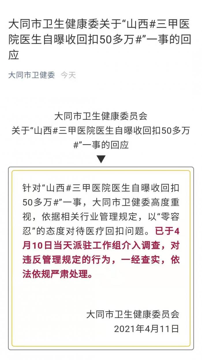 三甲医院医生自曝收回扣50万,大同卫健委:已派工作组调查