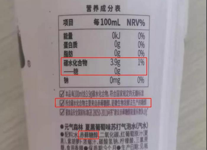 而苏打气泡水的营养成分表则显示,每100ml饮料中含糖0g,含碳水化合物3.9g,饮料中所含的碳水化合物主要来自赤藓糖醇。