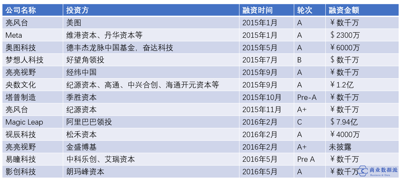 资本的持续关注对当时AR行业发展起了推波助澜作用。2015年到2016年,AR领域融资金额少则千万多则上亿,最引人关注的莫过于阿里巴巴领投Magic Leap C轮融资,金额高达7.94亿美元,让这家当时还没推出任何产品的公司一跃成为估值超过35亿美金的巨型独角兽。