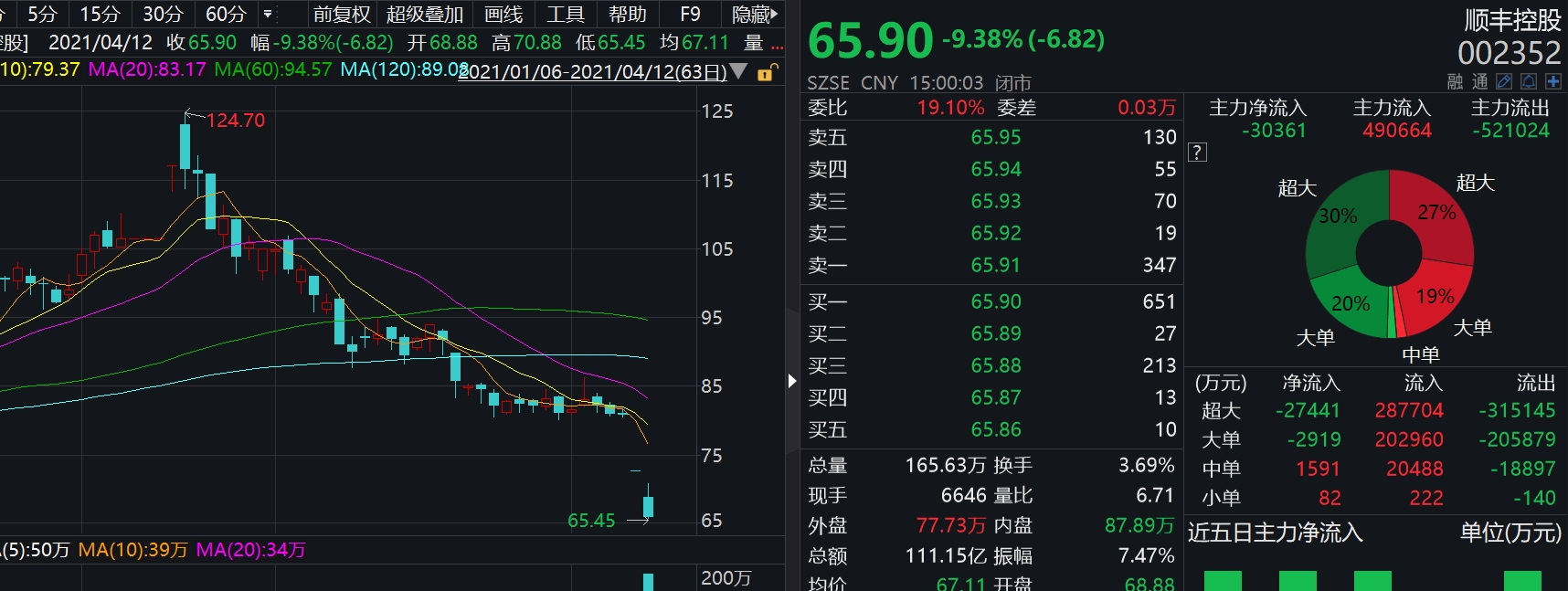 顺丰控股成交额超100亿元,创历史新高,公司股价午后一度触及跌停,截止收盘,报65.9元,跌幅-9.38%。