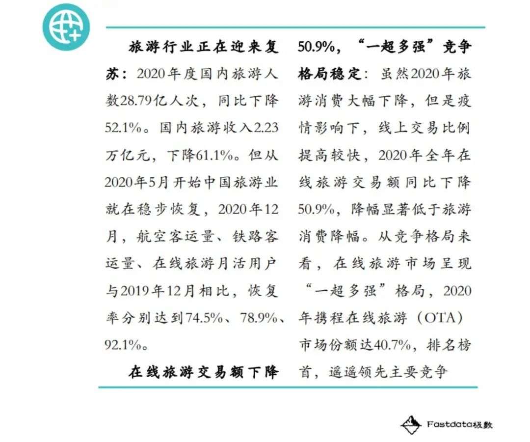 时间来到2020年,突如其来的新冠疫情对国内旅游行业造成巨大打击,据Fastdata极数发布的《2020年中国在线旅游行业报告》数据显示,2020年国内旅游人数28.79亿人次,同比下降52.1%,国内旅游收入2.23万亿元,下降61.1%。而这一年,同程旅行仍仅占在线旅游市场份额10%,远落后于携程、美团、去哪儿旅行三家。