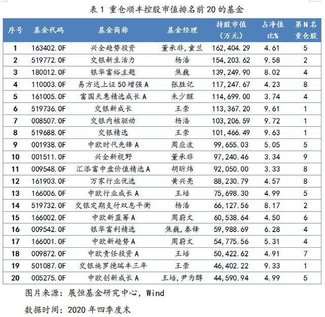 董承非、杨浩、焦巍、朱少醒、王崇、周应波、胡昕炜、黄兴亮、王培、周蔚文等明星基金经理旗下基金均重仓持有顺丰控股。其中,董承非管理的兴全趋势投资在2020年末对顺丰的持仓市值最高达到16.24亿元,在其前十大重仓股中位列第五,杨浩的交银新生活力和焦巍的银华富裕主题持仓市值分别为15.42亿元、13.92亿元。