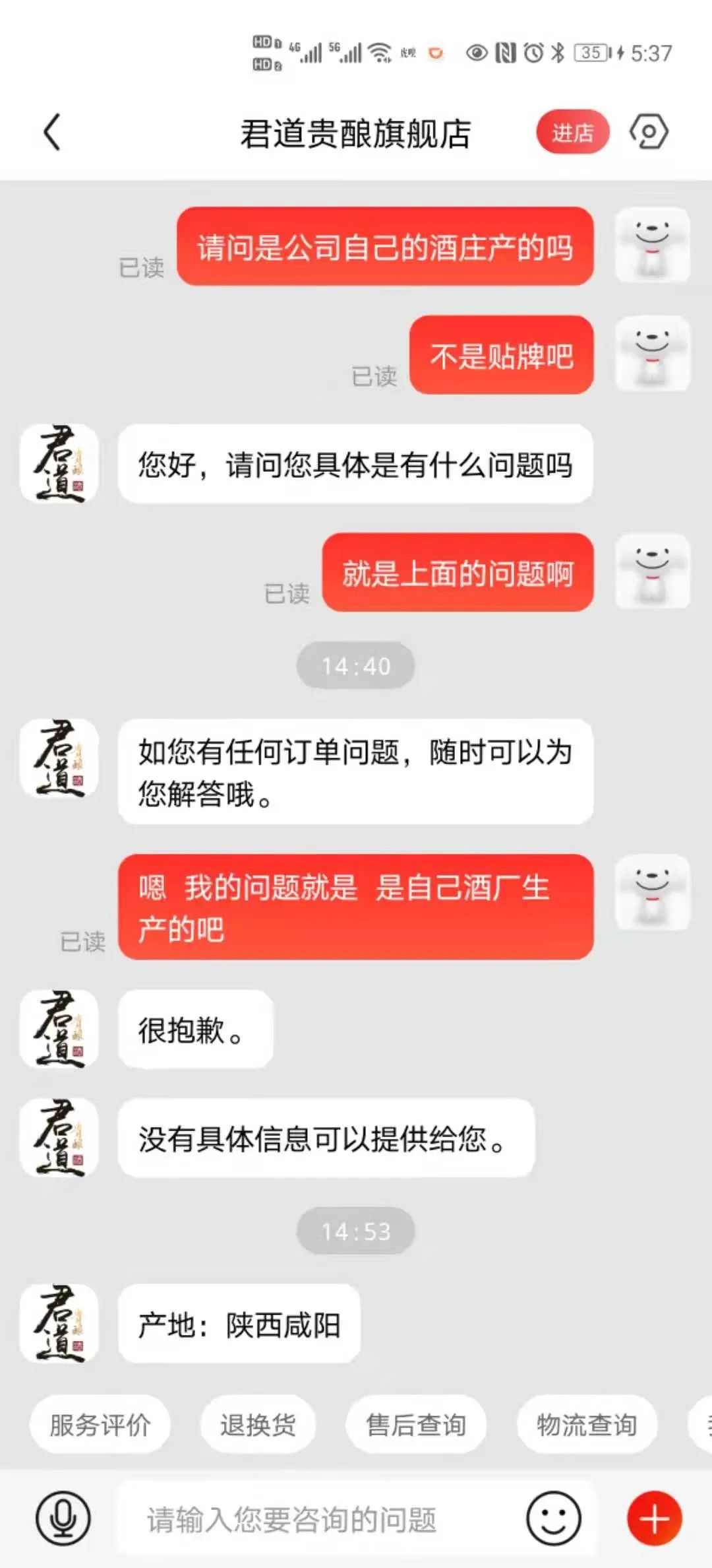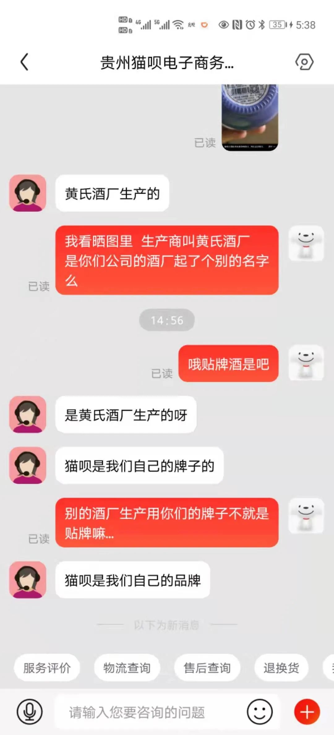 有趣的是,即便业内人士认为贴牌没有问题,品牌商却对此讳莫如深。陆玖财经在京东和淘宝上询问了十七光年和猫呗官方旗舰店,其产品是否为其他酒厂代工或是否为贴牌销售,客服或表示不予回答,或顾左右而言他。