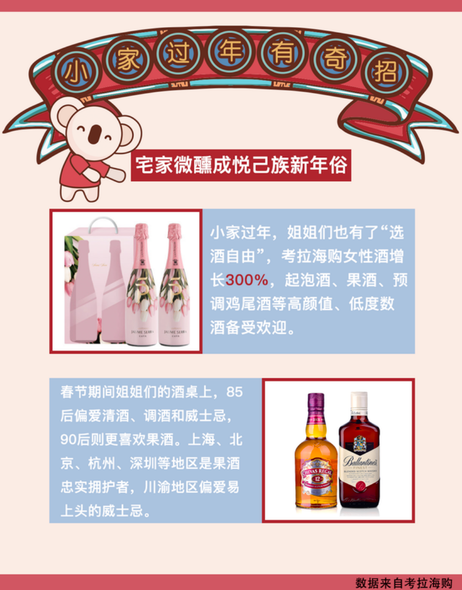 去年天猫“55大促”、“618”、“双11”、年货节期间的数据都显示,果酒类在每次大促和购物节期间,果酒类的销售同比增长率都在100%以上。京东超市“双11”当天果酒销售额同比增长近40倍,考拉海购今年春节期间“女性酒”(包括气泡酒、果酒等)增长300%,尤其是90后,更偏爱果酒。