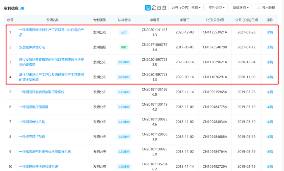 企查查显示,梅见所属的重庆江记酒厂共有38条专利信息,其中不乏酒类酿造方法,足以见得其在生产工艺上的用心。
