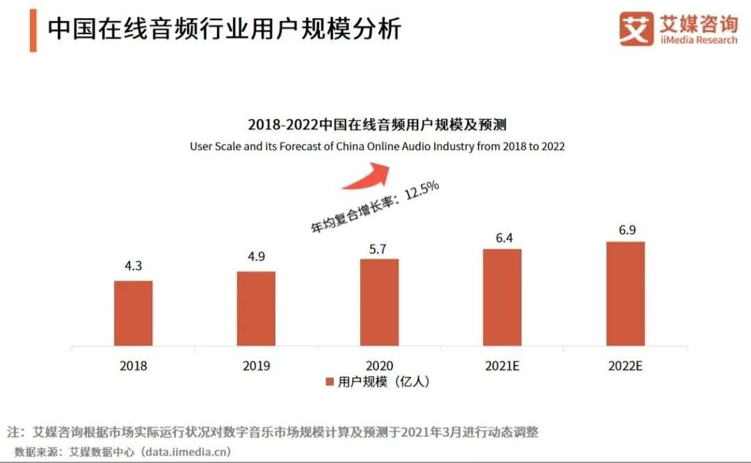 · 4月5日,据iiMedia Research(艾媒咨询)发布的《2020-2021年中国在线音频行业研究报告》数据显示,2020年中国在线音频用户规模达到5.7亿人,2022年有望升至6.9亿人。
