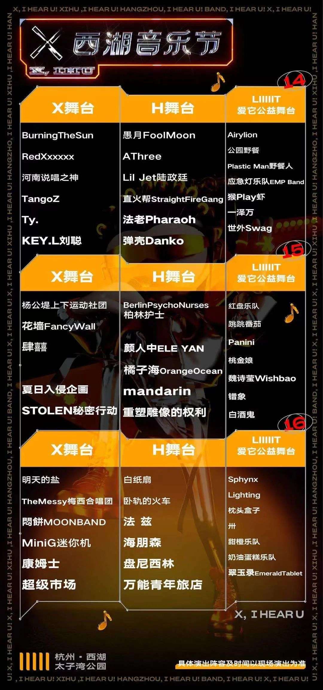 · 4月5日,杭州西湖音乐节全阵容官宣:弹壳Danko、刘聪的KEY、法老_Pharaoh、StraightFireGang直火帮、重塑雕像的权利、mandarin、橘子海OrangeOcean、秘密行动、颜人中、夏日入侵企画、肆囍乐队、Schoolgirlbyebye乐队、万能青年旅店乐队、盘尼西林乐队、康姆士COMZ等,音乐节将于5月14日至16日在杭州太子湾公园举行。