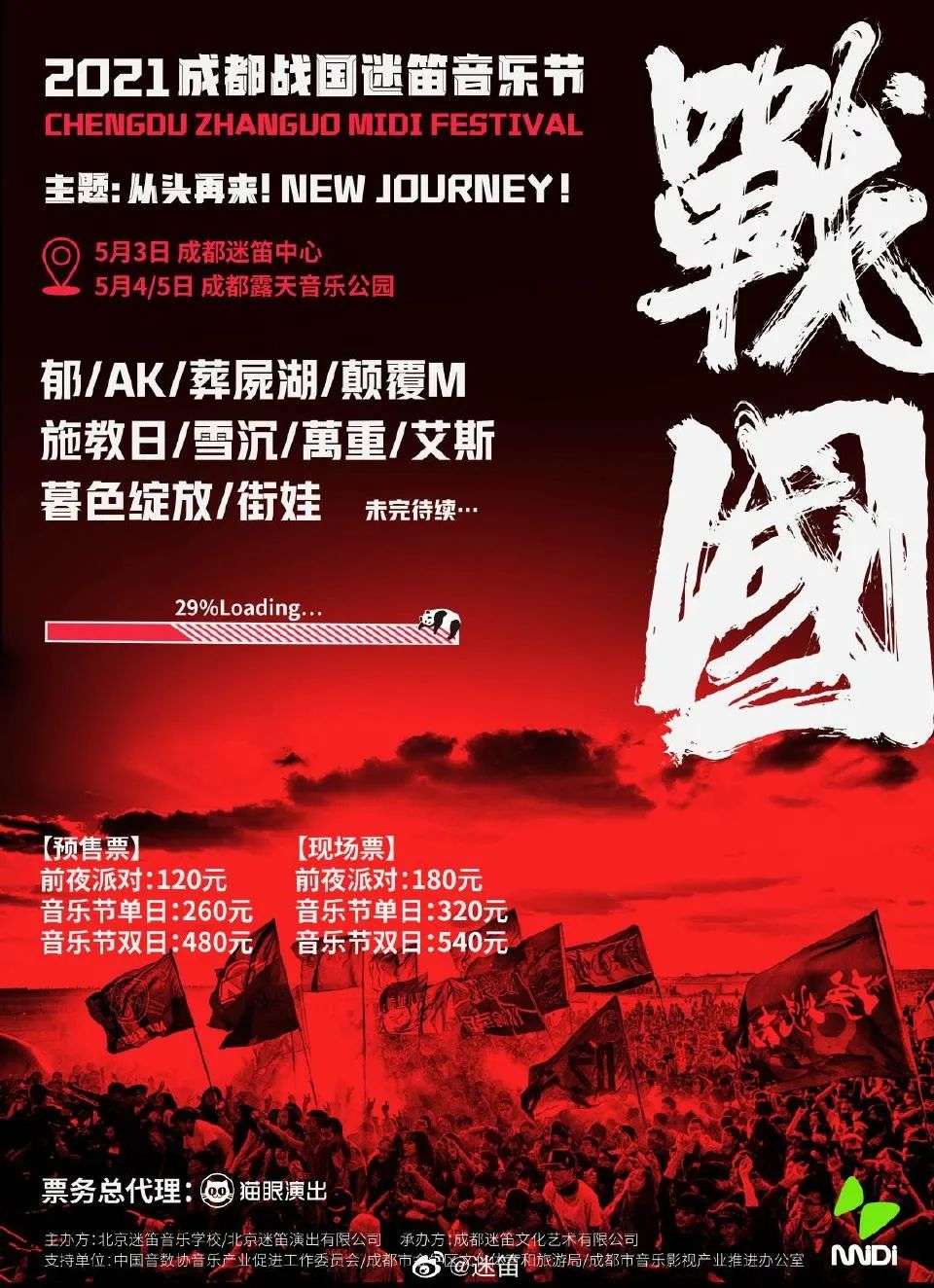 · 4月8日,成都战国迷笛音乐节首批阵容公布:郁、AK、葬屍湖、颠覆M、施教日、雪沉、萬重、艾斯、暮色绽放、街娃,音乐节将于5月3日至5日在成都迷笛中心和成都露天音乐公园举行。