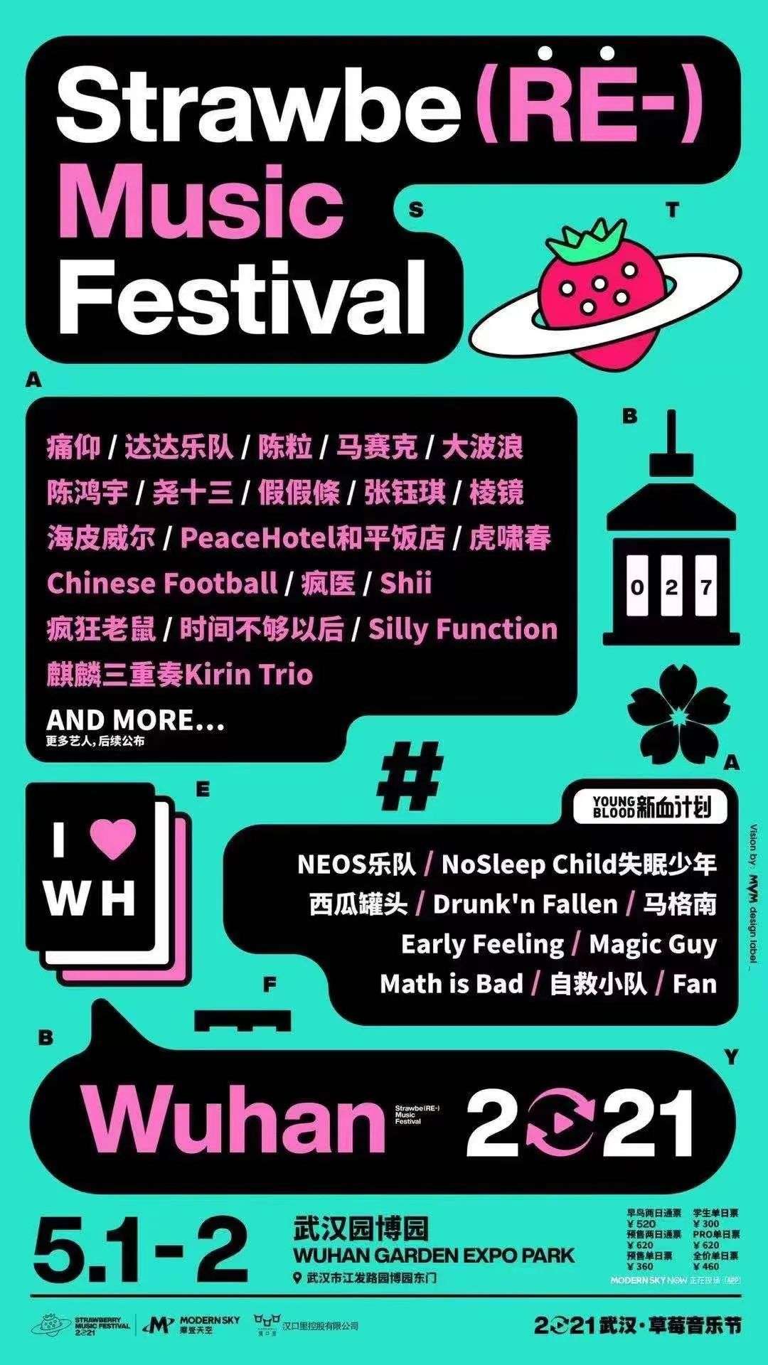 · 4月8日,武汉草莓音乐节主要阵容官宣:痛仰、达达乐队、陈粒、马赛克、大波浪、陈鸿宇、尧十三、假假條、张钰琪、棱镜、海皮威尔、PeaceHotel和平饭店、虎啸春、Chinese Football、疯医等,音乐节将于5月1日至2日在武汉园博园举行。同时,长沙草莓音乐节时间及地点官宣,音乐节将于6月12日至13日在长沙国际会展中心西广场举行。