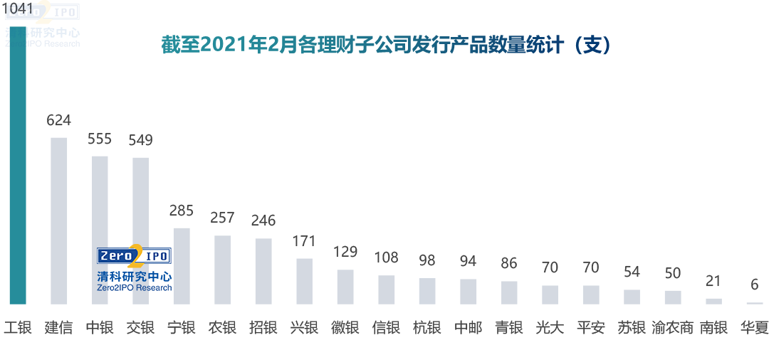 图1 截至2021年2月各理财子公司发行产品数量统计(支)