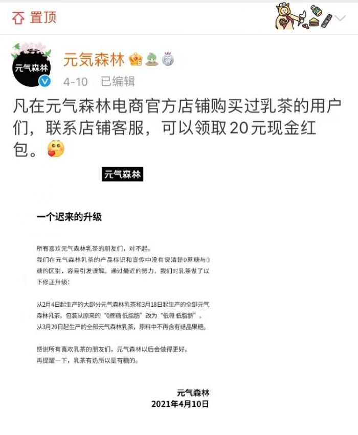 4月10日晚,元气森林在《一个迟来的升级》致歉声明中表示,其乳茶产品的产品标示和宣传中,没有说明“0蔗糖”与“0糖”的区别,容易引发误解。近期已对乳茶产品做了修正升级,从2月4日起生产的大部分乳茶和3月18日起生产的全部乳茶,包装从原来的“0蔗糖 低脂肪”改为“低糖 低脂肪”。元气森林同时提醒:乳茶有奶所以是有糖的。