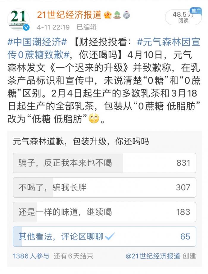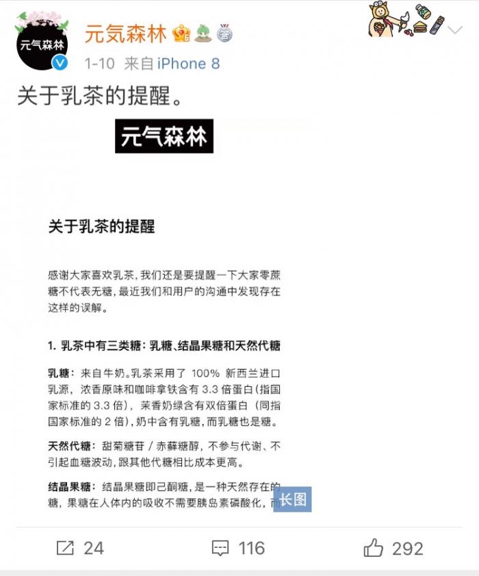 近日,元气森林在其官方微博发布致歉声明称,其乳茶产品未说明“0蔗糖”与“0糖”的区别,容易引发误解,近期已对乳茶产品做了修正升级,并提醒消费者“乳茶有奶所以是有糖的。”
