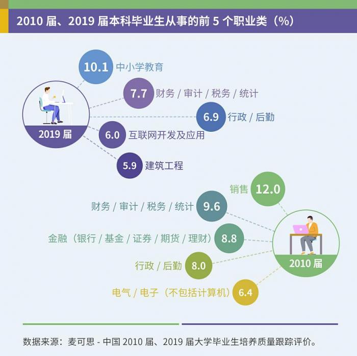与2010届相比,2019届本科生就业比例增加最多的职业类为“中小学教育”(增加7.5个百分点),其次是互联网开发及应用(增加4.2个百分点)。