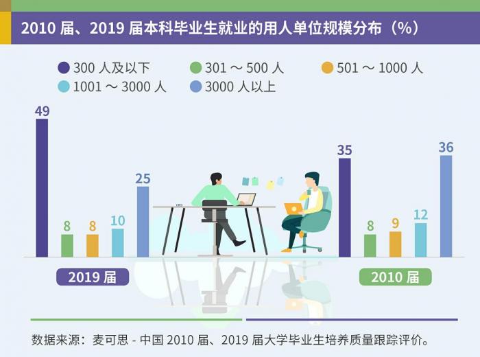 麦可思研究还发现,得益于民营和中小微企业的迅猛发展,十年来,本科生在民企、中小规模企业就业的比例明显提升,这类企业正成为吸纳就业的主力军。