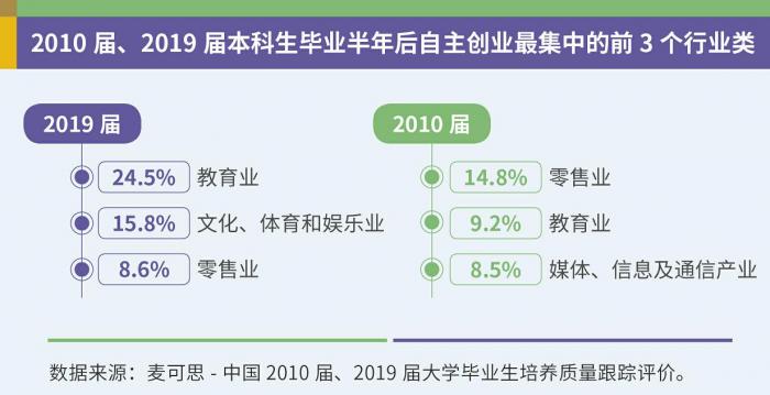 本科生创业最集中的领域随着社会需求变化也发生改变,从“零售业”(2010届:14.8%)转变为“教育业”(2019届:24.5%)和“文化、体育和娱乐业”(2019届:15.8%)。