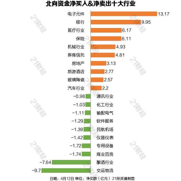 4月12日,北向资金净买入43.04亿元,其中沪股通净买入42.3亿元,深股通净买入0.74亿元。增持电子元件,减持交运物流。