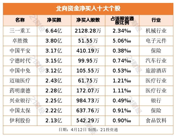 个股方面,北向资金净买入三一重工(600031.SH)、卓胜微(300782.SZ)、中国平安(601318.SH)、宁德时代(300750.SZ)、中国中免(601888.SH)居前。