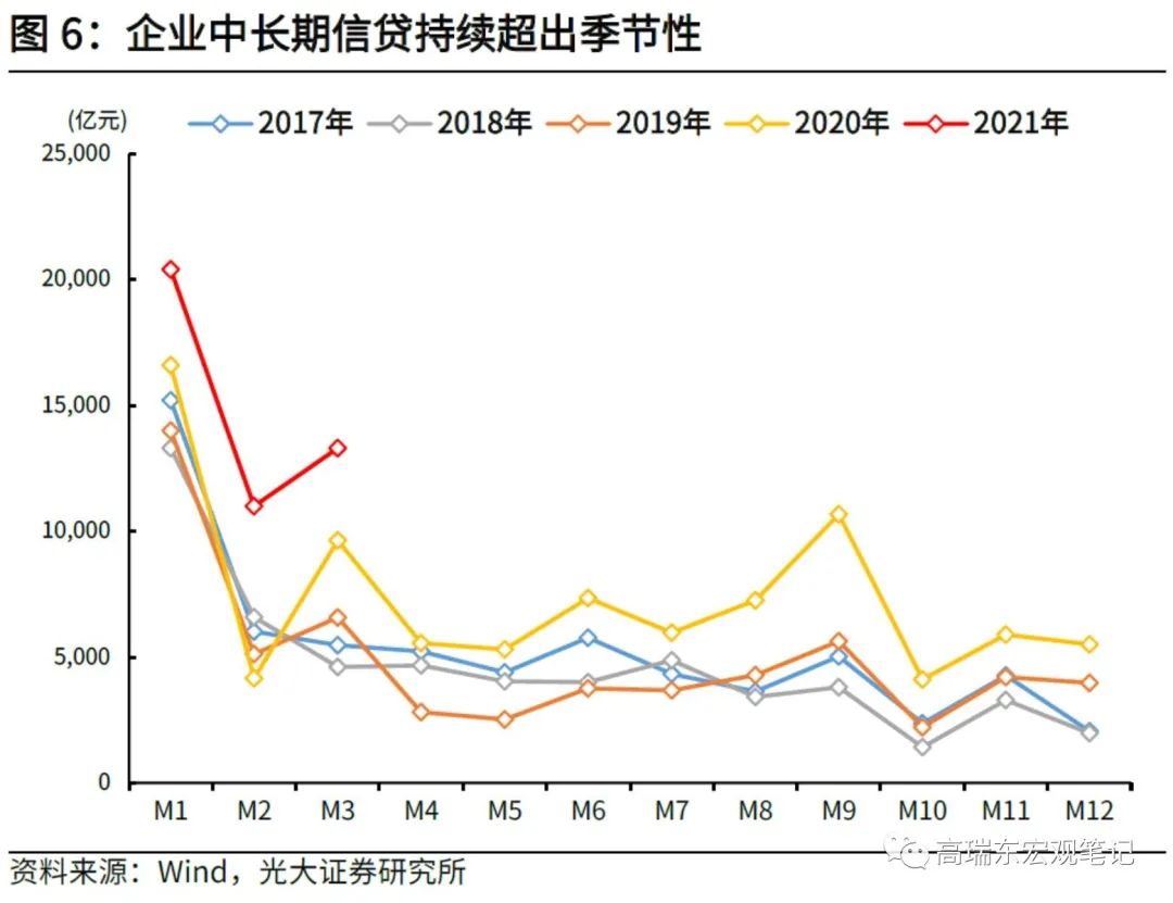 居民中长期新增信贷显著超出季节性。2020年在居民住房贷款的推动下,居民中长期贷款表现频频超出季节性规律。虽然今年以来楼市监管明显趋严,叠加个人经营性贷款及消费贷政策呈现边际收紧,但居民中长期新增信贷仍显著超出季节性规律。