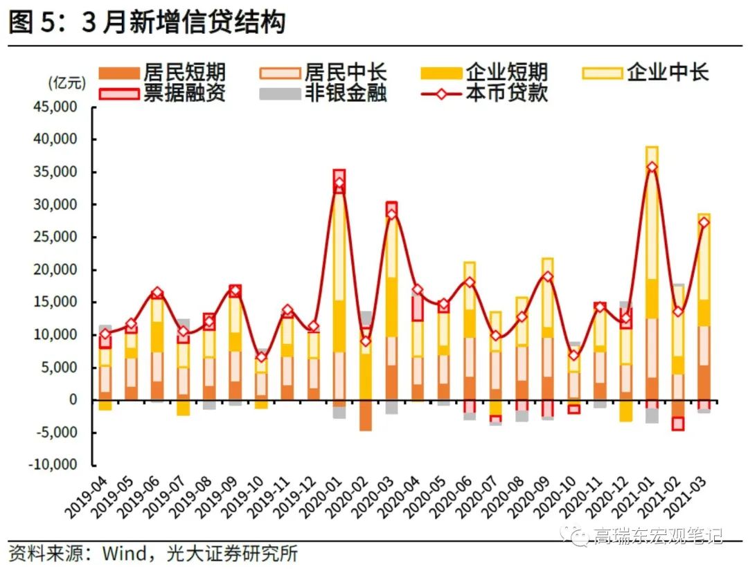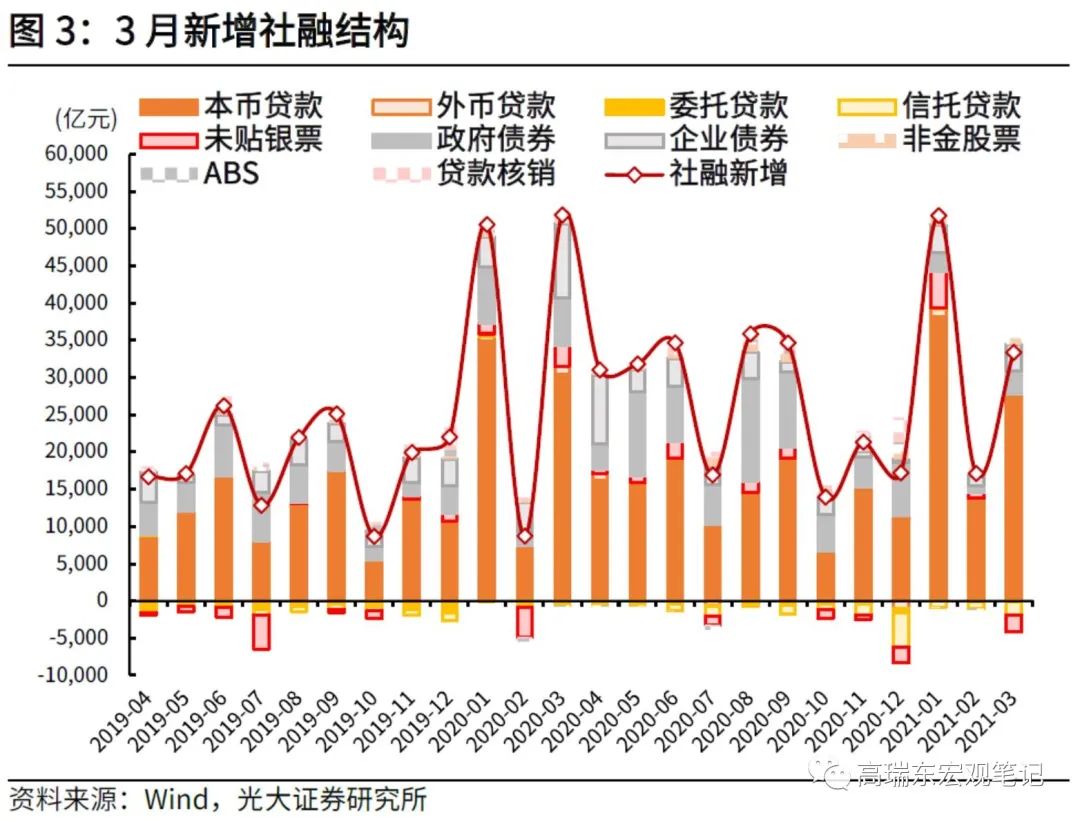 3月新增信贷2.73万亿元,相较2020年同期少增1200亿元,但相较2019年同期多增1.04万亿,显著超出季节性,居民部门与企业部门中长期信贷均表现亮眼。