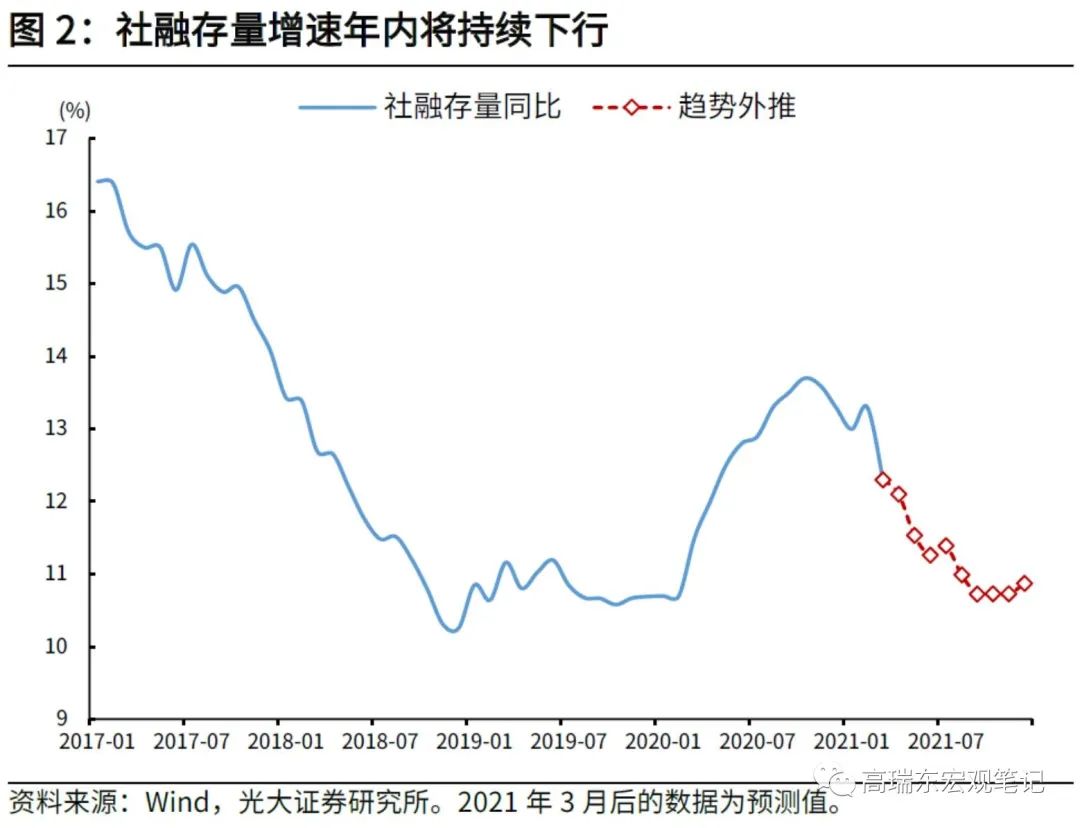 展望来看,一方面,在PMI、工业企业利润等指标显著回暖背景下,企业融资意愿持续强劲,融资需求短期内难以明显收缩。但受制于宏观杠杆率以稳为主的政策基调,全年信贷规模增量有限,叠加当下PPI呈现出陡峭上行的阶段性通胀压力,央行对信贷投放节奏控制趋严的概率有所上升。另一方面,今年地方政府专项债额度并未提前下达,虽然3月份地方债发行重启,但并未放量,预计4月份政府债券发行节奏将会明显加快。综合来看,在去年高基数及信贷额度控制的背景下,社融增速将会延续下行走势,但融资需求依然旺盛,新增社融仍有支撑。