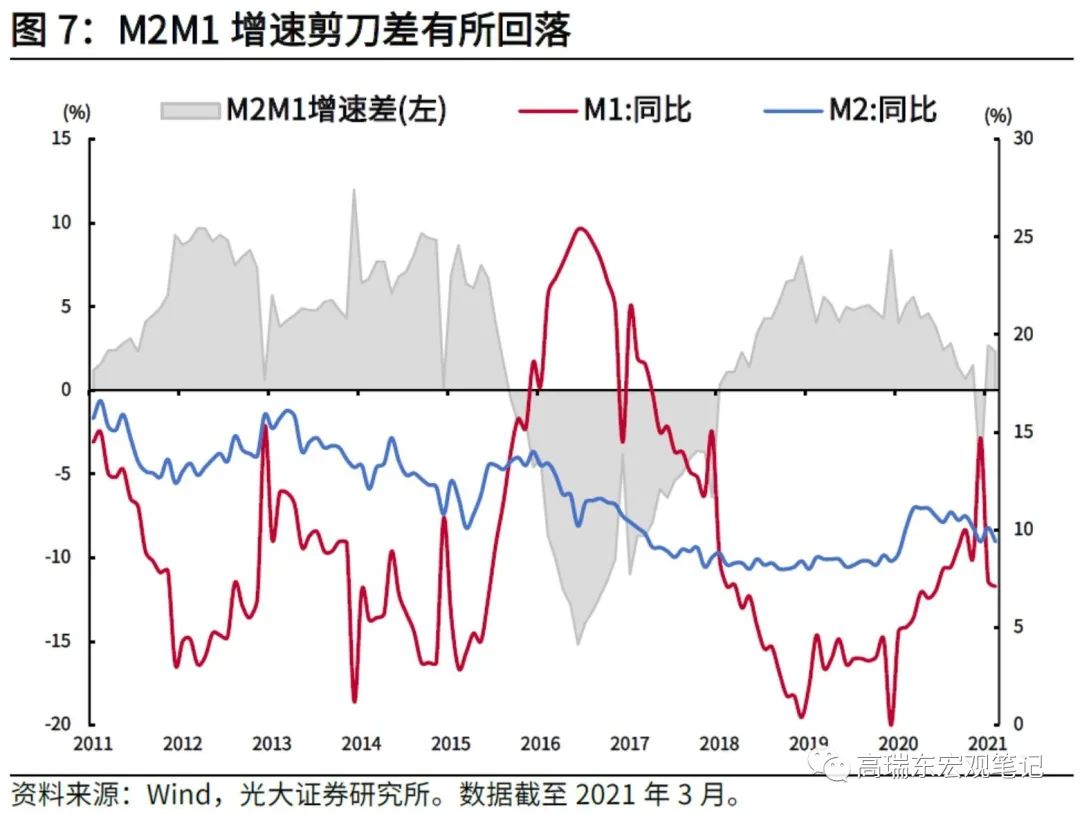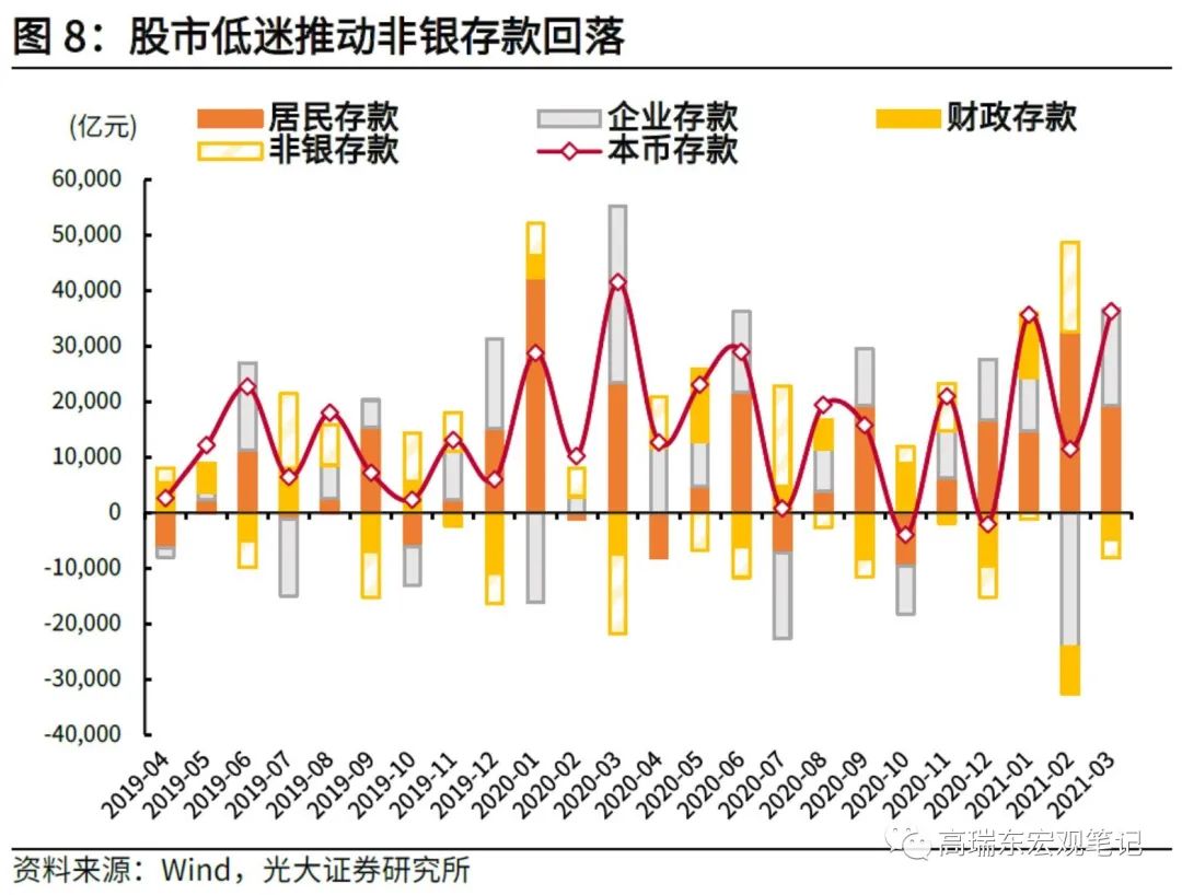3月M2回落0.7个百分点至9.4%,M1回落0.3个百分点至7.1%,M2、M1增速剪刀差回落0.4个百分点至2.3%。3月新增人民币存款3.63万亿元,受A股市场大幅回撤影响,非银存款收缩3280亿元。